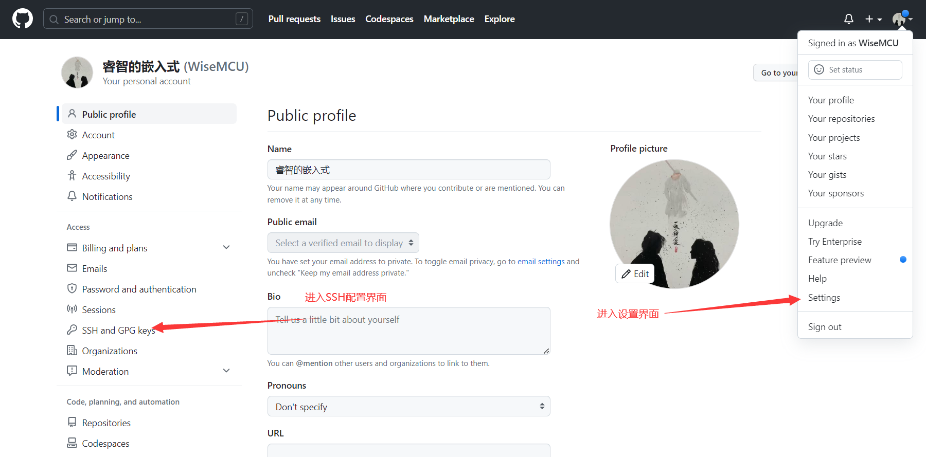 先注册Github账号,然后进入设置,再点击左侧的SSH配置