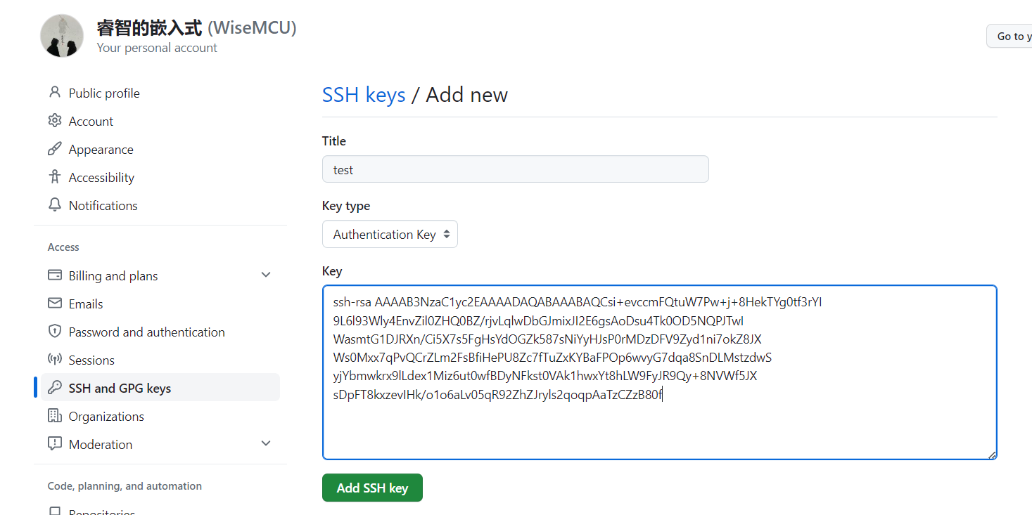 标题名字可以随便起,尽量能够提醒自己这个公钥的私钥是在哪里使用的,然后在key里面填入公钥,公钥文件可以直接用记事本打开,下面是生成的公钥样式