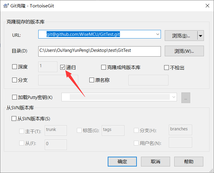 勾选递归克隆,再点确定,这里需要注意这个过程的流程,当点确定之后,Git会先在本地创建一个Git仓库(我们在Github网站创建的仓库也是一个Git仓库),再把远端的Git仓库(这个仓库就是我们在Github创建的仓库)的所有文件同步下来