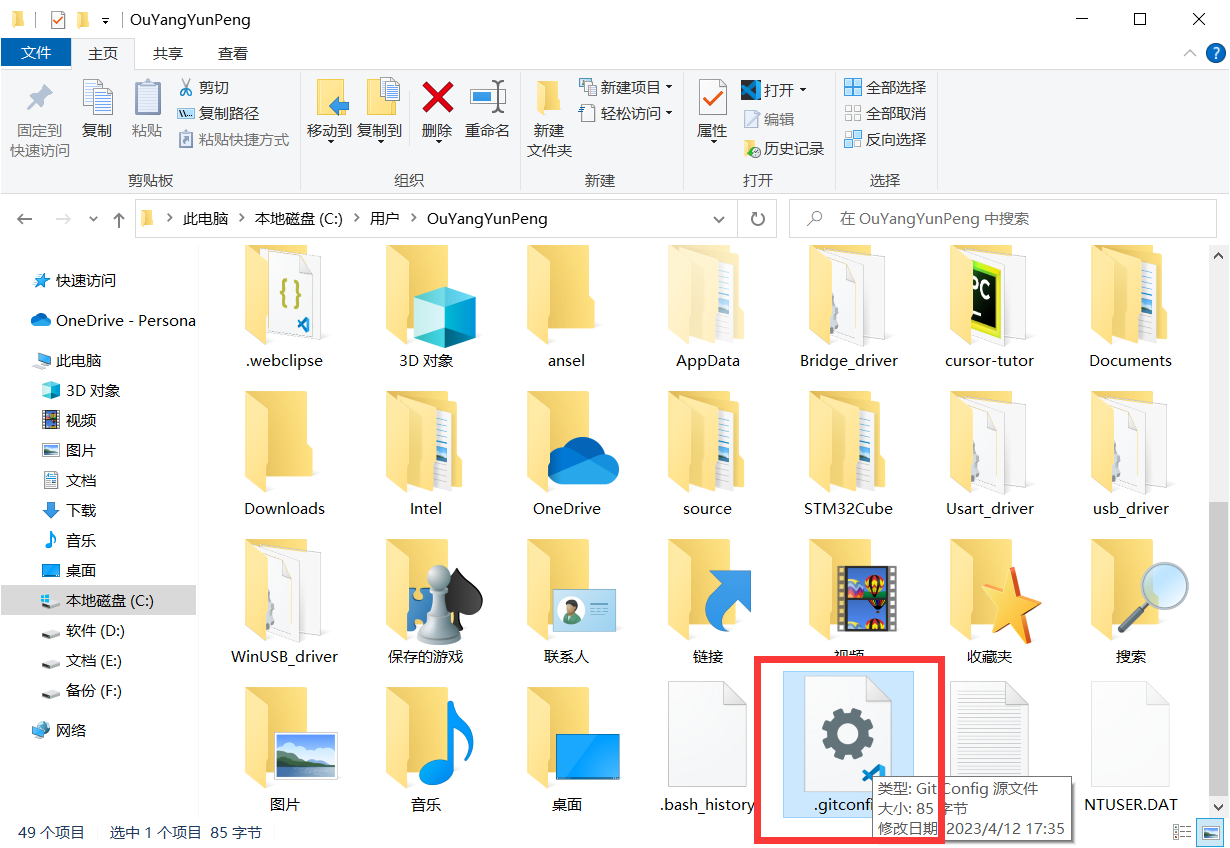 如果用户信息想修改或者没有填不知道该怎么填可以C盘 -> 用户 -> <自己的用户名> 找到或者自己创建 .gitconfig 文件,名字前面有小数点,里面的内容如下