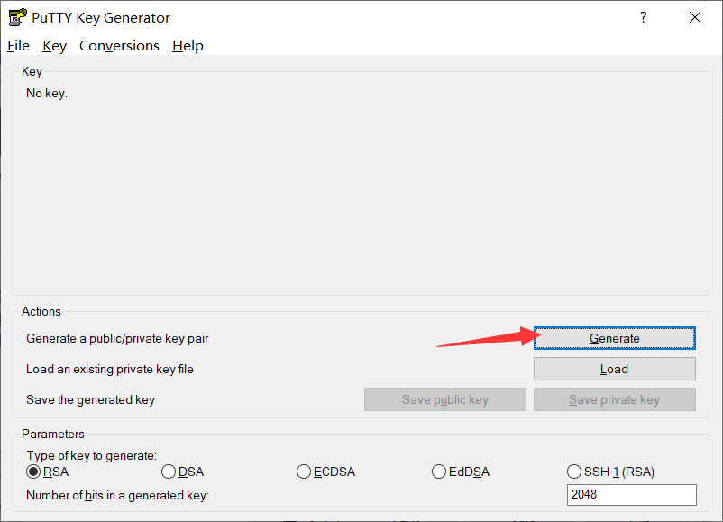 进入密钥对生成界面,点击 Generate 并快速晃动鼠标(鼠标不动进度条是不会动的,因为是根据鼠标的坐标生成的随机密钥对)