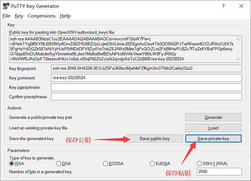 生成完毕获得SSH的公钥和私钥,分别点击 Save public key 和 Save private key 保存公钥和私钥