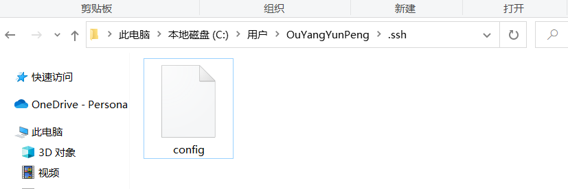 然后在 C:\Users\<这里根据你电脑的名称来>.ssh 文件夹里面创建config文件,注意 .ssh 是文件夹不是一个文件,config文件是没有后缀的,如下图所示