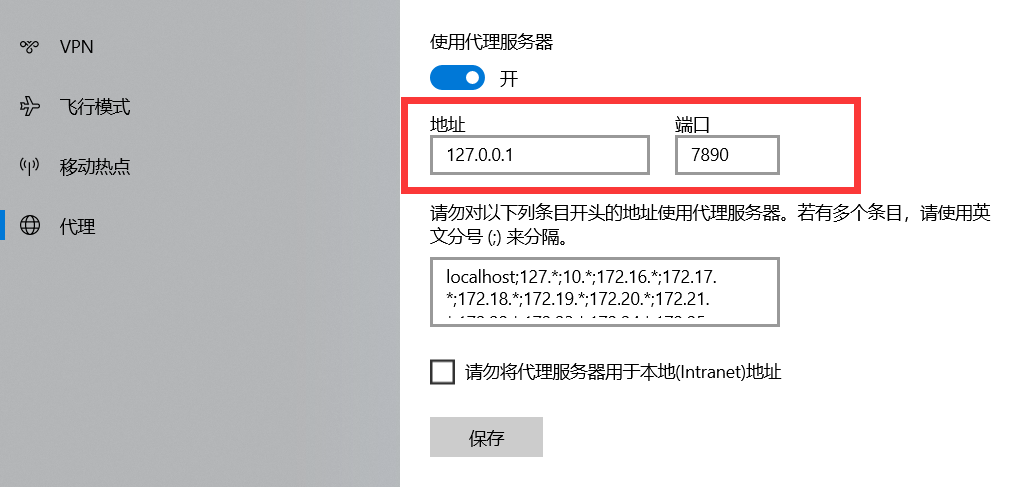开启代理服务,并打开 电脑设置 -> 网络 -> 代理 查看代理IP和端口,请注意这个代理并不是自己在设置中打开并填入下图的数字,一般是需要有个VPN服务,开启VPN服务会自动配置并打开代理