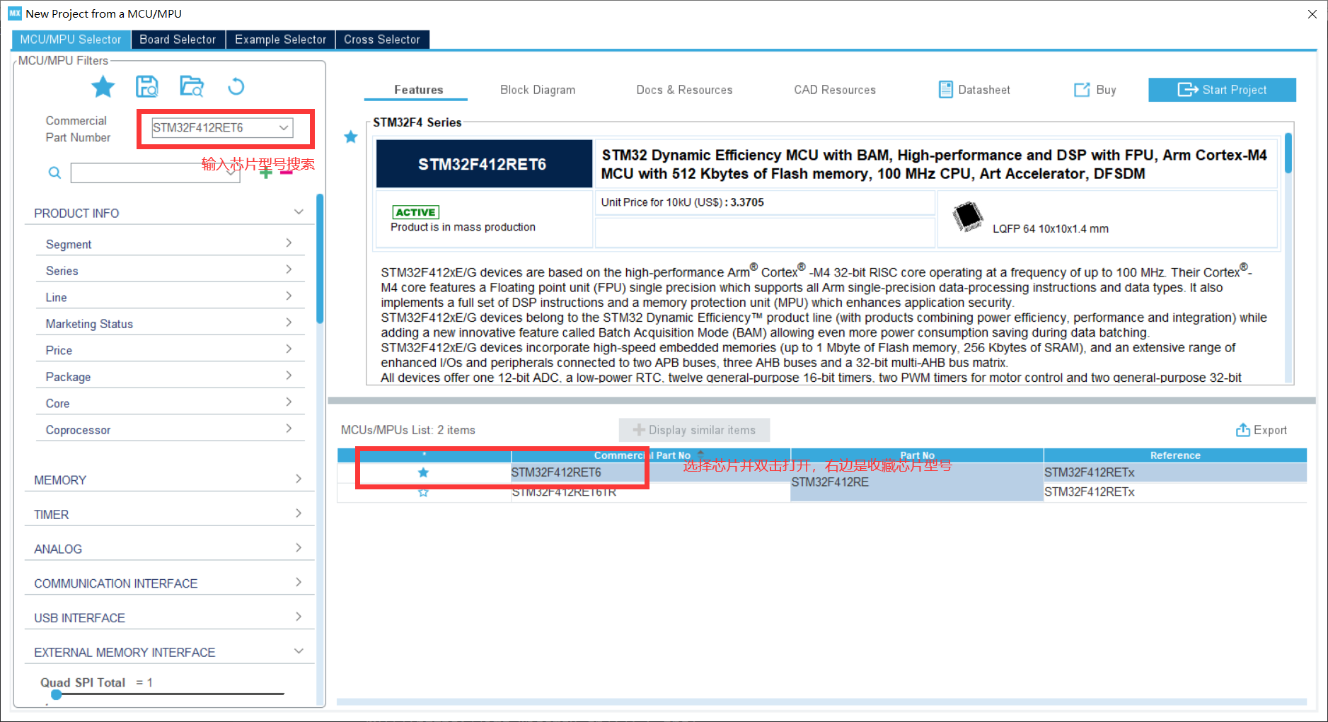 输入STM32F412RET6后双击STM32F412RET6打开芯片配置界面