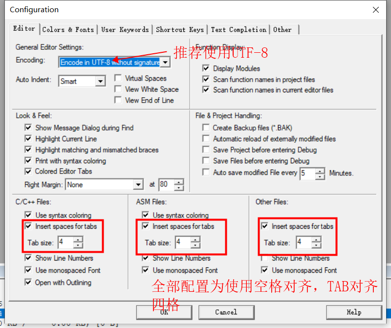 作者的个人偏好是使用UTF-8编码方式,TAB为4空格对齐